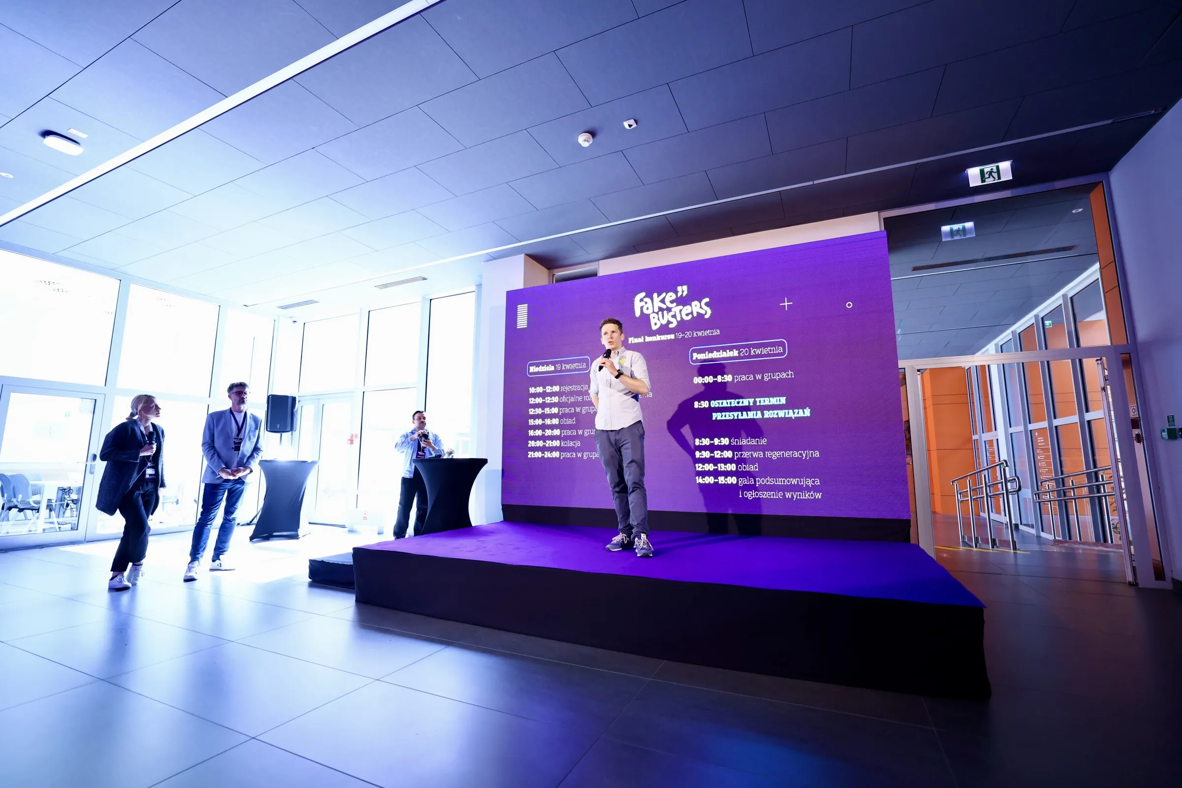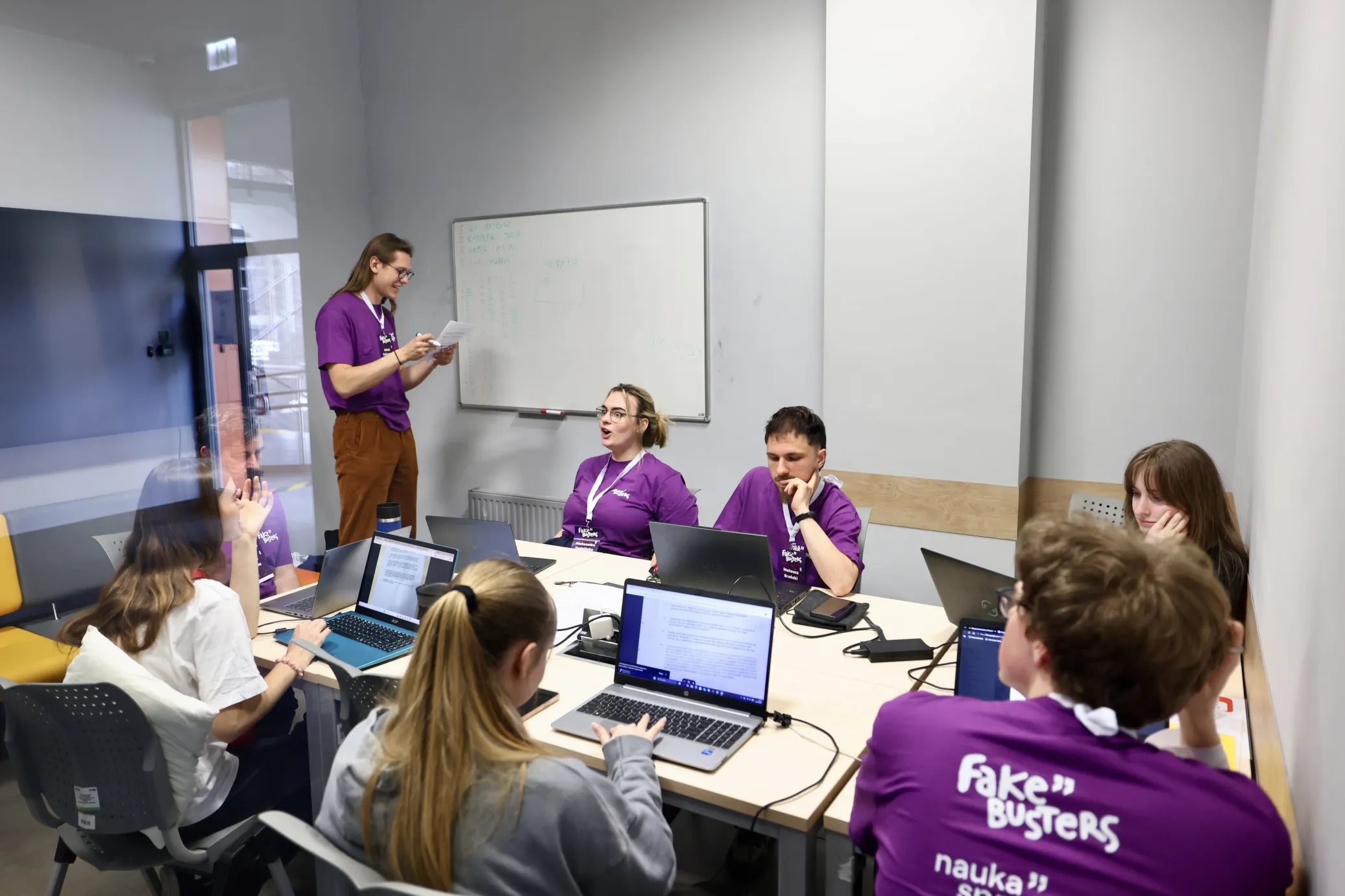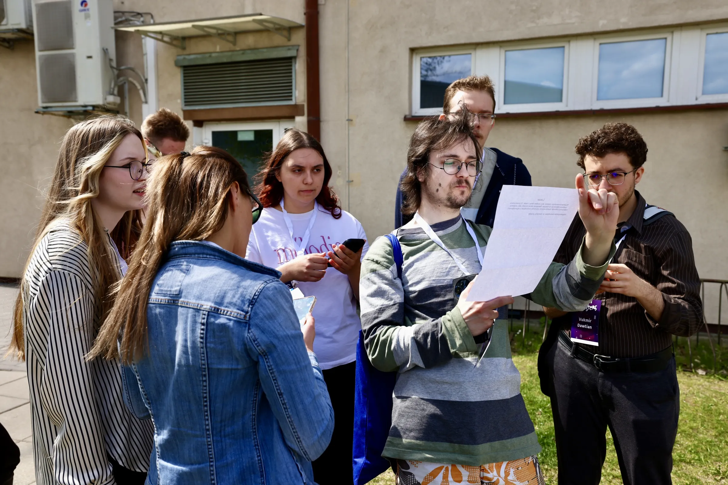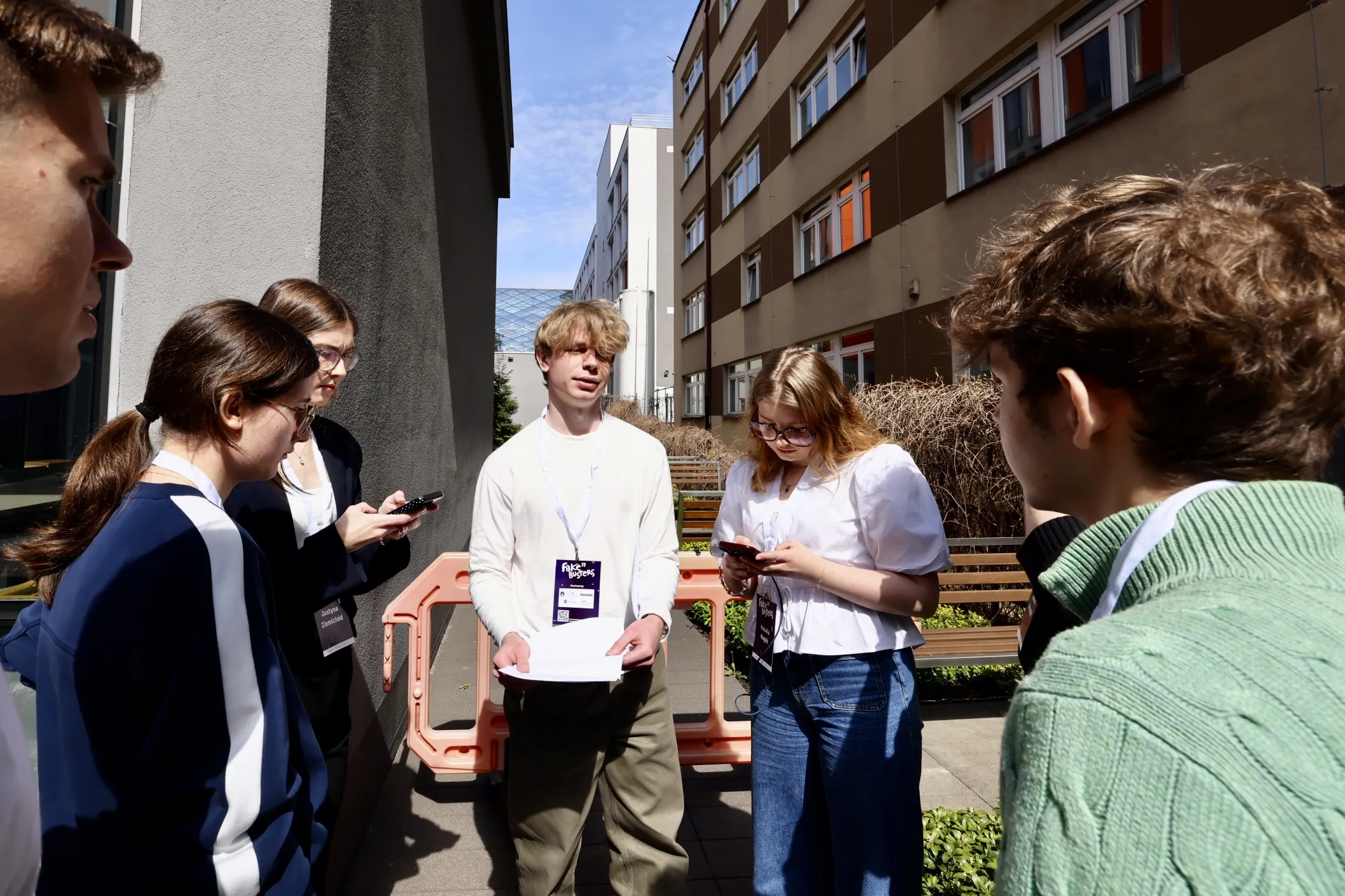 Punktualnie o 12 uczestniczki i uczestnicy zostali przywitani przez przedstawicieli organizatora i członków Zespołu merytorycznego. Powiadomiono ich o zasadach bezpieczeństwa i o wyzwaniach, które dla nich przygotowano. Następnie rozpoczęła się rywalizacja. Jej początek stanowiło zadanie, polegające na odnalezieniu swojej grupy jedynie za pomocą zdjęcia a następnie, przemieszczając się po przygotowanych wskazówkach, trzeba było odnaleźć hasło, które dawało dostęp do pokoju, w którym grupa otrzymywała kolejne zadania. Gra terenowa, której rozwiązaniem było słowo DEZINFORMACJA, wskazała przestrzenie do pracy wszystkim 10 grupom. W tych salach, przez kolejne kilkanaście godzin finalistki i finaliści odpowiadali na kilkadziesiąt pytań oraz przygotowywali prezentację, która pokazać miała, jak członkinie i członkowie grupy proponują rozwiązać problem dezinformacji. Byli z nami studentki i studenci, reprezentujący takie miasta jak Białystok, Dęblin, Elbląg, Gdańsk, Gliwice, Katowice, Kraków, Lublin, Łódź, Olsztyn, Płock, Poznań, Szczecin, Tarnów, Toruń, Warszawa, Wrocław czy Zielona Góra. Największym sukcesem było dla nas zgromadzenie reprezentantów z wielu różnych uczelni. Do finału, pokonując kilkuset rywali, dostali się studenci, na co dzień kształcący się w takich ośrodkach jak Politechnika Białostocka, Uniwersytet w Białymstoku, Lotnicza Akademia Wojskowa w Dęblinie, Akademia Nauk Stosowanych w Elblągu, Politechnika Gdańska, Uniwersytet Gdański, Politechnika Śląska, Uniwersytet Ekonomiczny w Katowicach, Akademia Górniczo – Hutnicza im. Stanisława Staszica w Krakowie, Politechnika Krakowska im. Tadeusza Kościuszki, Uniwersytet Jagielloński w Krakowie, Uniwersytet Rolniczy im. Hugona Kołłątaja w Krakowie, Uniwersytet Marii Curie-Skłodowskiej w Lublinie, Akademia Humanistyczno – Ekonomiczna w Łodzi, Uniwersytet Łodzki, Uniwersytet Medyczny w Łodzi, Uniwersytet Warmińsko-Mazurski w Olsztynie, Akademia Mazowiecka w Płocku, Collegium Da Vinci w Poznaniu, Uniwersytet im. Adama Mickiewicza w Poznaniu, Uniwersytet WSB Merito w Poznaniu, Uniwersytet Szczecinski, Akademia Tarnowska, Uniwersytet WSB Merito w Toruniu, Akademia Sztuki Wojennej w Warszawie, Politechnika Warszawska, Polska Akademia Nauk (Graduate School for Social Research), Uczelnia Łazarskiego, Uczelnia Medyczna im. Marii Skłodowskiej- Curie w Warszawie, Politechnika Wrocławska, Uniwersytet Przyrodniczy we Wrocławiu, Uniwersytet Zielonogórski oraz oczywiście Uniwersytet Warszawski.