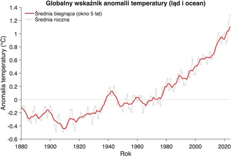 Na wykresie widać pojedyncze, szare punkty oznaczające kolejne lata – „skaczą” one naprzemiennie w górę i w dół. W jednym roku może być nieco cieplej, w innym trochę chłodniej. Są to naturalne wahania pogody. Czerwona linia to anomalie temperatury uśrednione w 5-letnich przedziałach. Taki zabieg pozwala wygładzić te naturalne wahania i unaocznić trend, czyli kierunek zmian. W tym przypadku linia wyraźnie idzie w górę – oznacza to, że Ziemia jako całość systematycznie się ociepla, mimo międzyrocznych wahań.