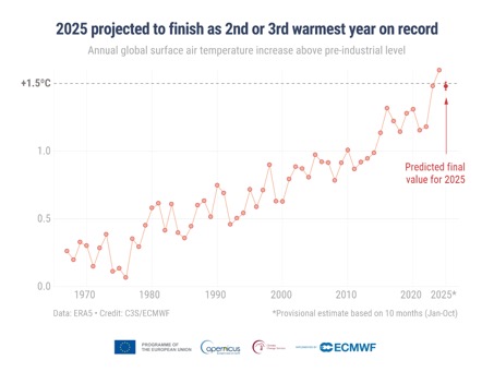 Kiedy w Porozumieniu paryskim ustalono cel, by nie dopuścić do ocieplenia klimatu o więcej niż 1,5°C względem epoki przedprzemysłowej, patrzono właśnie na trend globalnej temperatury, a nie na pojedyncze chłodniejsze czy cieplejsze lata. Na rysunku poniżej pokazano, jak zmienia się średnia globalna temperatura powietrza względem epoki przedprzemysłowej i jak blisko tego progu 1,5°C już jesteśmy. Widać, że w 2024 roku średnia anomalia przekroczyła ten poziom, a rok 2025 ma szansę być drugim lub trzecim najcieplejszym rokiem w historii pomiarów.