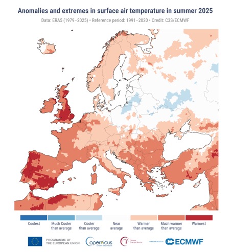 Na tej mapie wyraźnie widać, że większość obszarów Europy była cieplejsza niż zwykle, a regiony chłodniejsze od normy są nieliczne i zajmują znacznie mniejszą powierzchnię. To pokazuje, że lato 2025 w skali kontynentu było znacznie cieplejsze niż średnie temperatury w okresie 1991–2020.